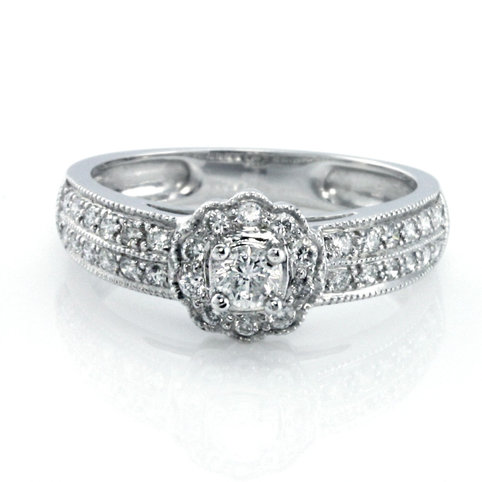 Beautiful half way halo engagment ring set with G-H color and VS-SI quality round cut diamonds in prong setting. Total carat weight on the ring is 0.50 CT. It is made with 14K white gold. The ring is sizable to your measurements. It comes with a presentation box. Free shipping and appraisal upon request.