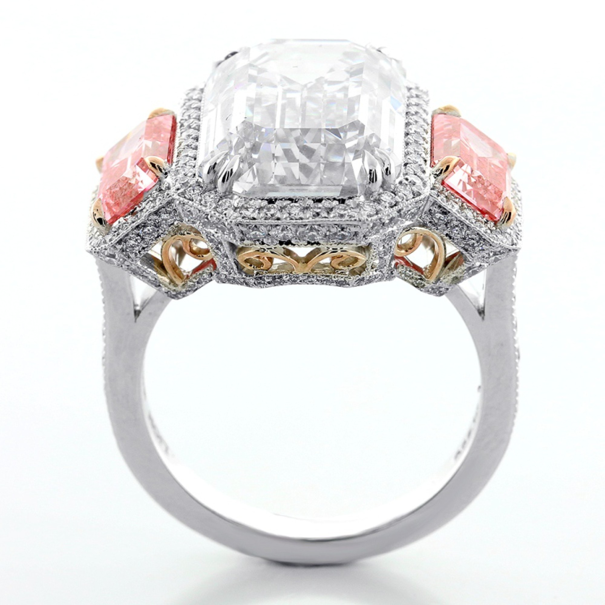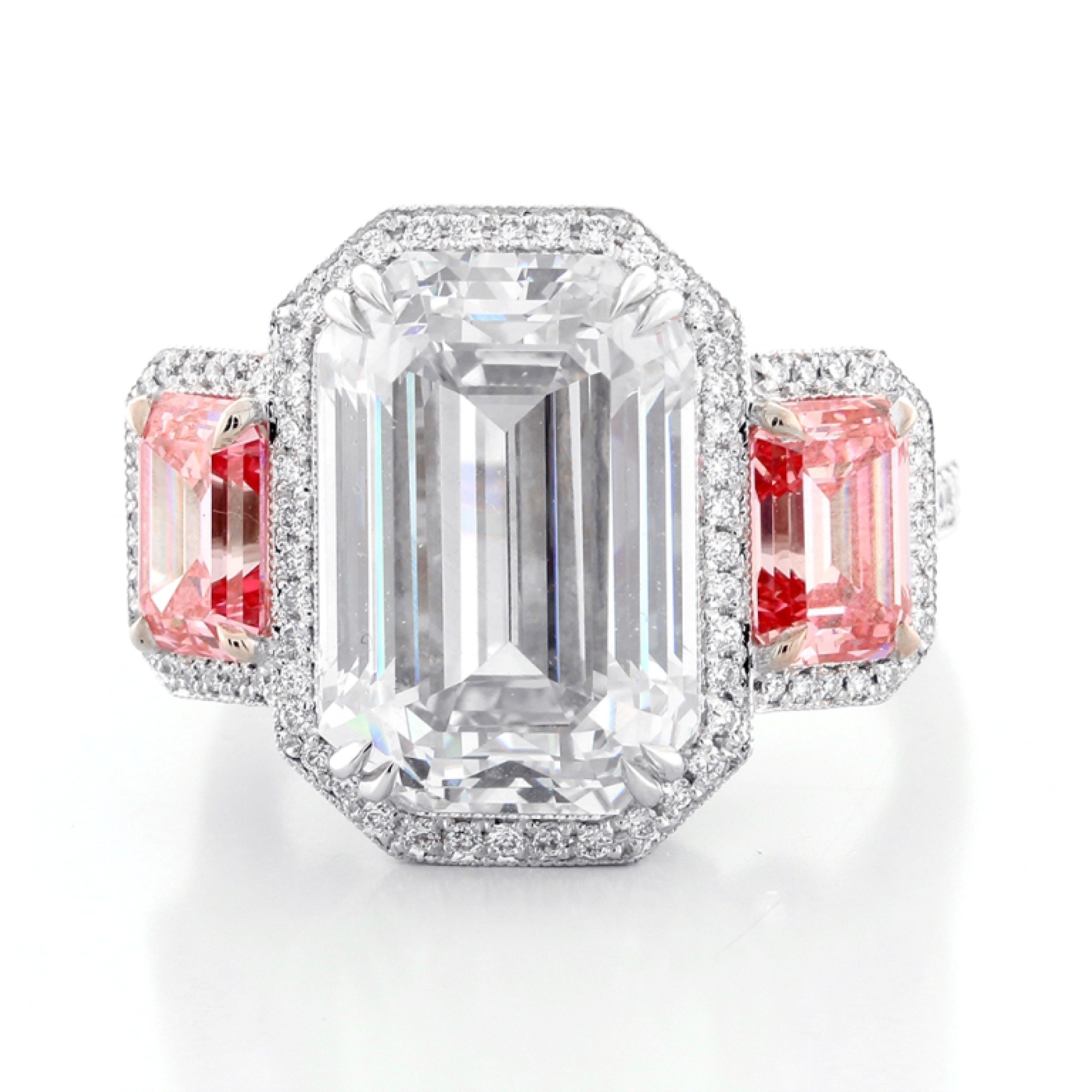 Dalia Diamonds adds yet another masterpiece to it's luxury line, this time featuring a 10.09ct. emerald cut center stone, and "two" 2.20ctw emerald cut side stones. Around the center stone you will find small round cut diamonds in a halo setting, weighing 0.84ct., made out of Platinum, weighing 14.00g.